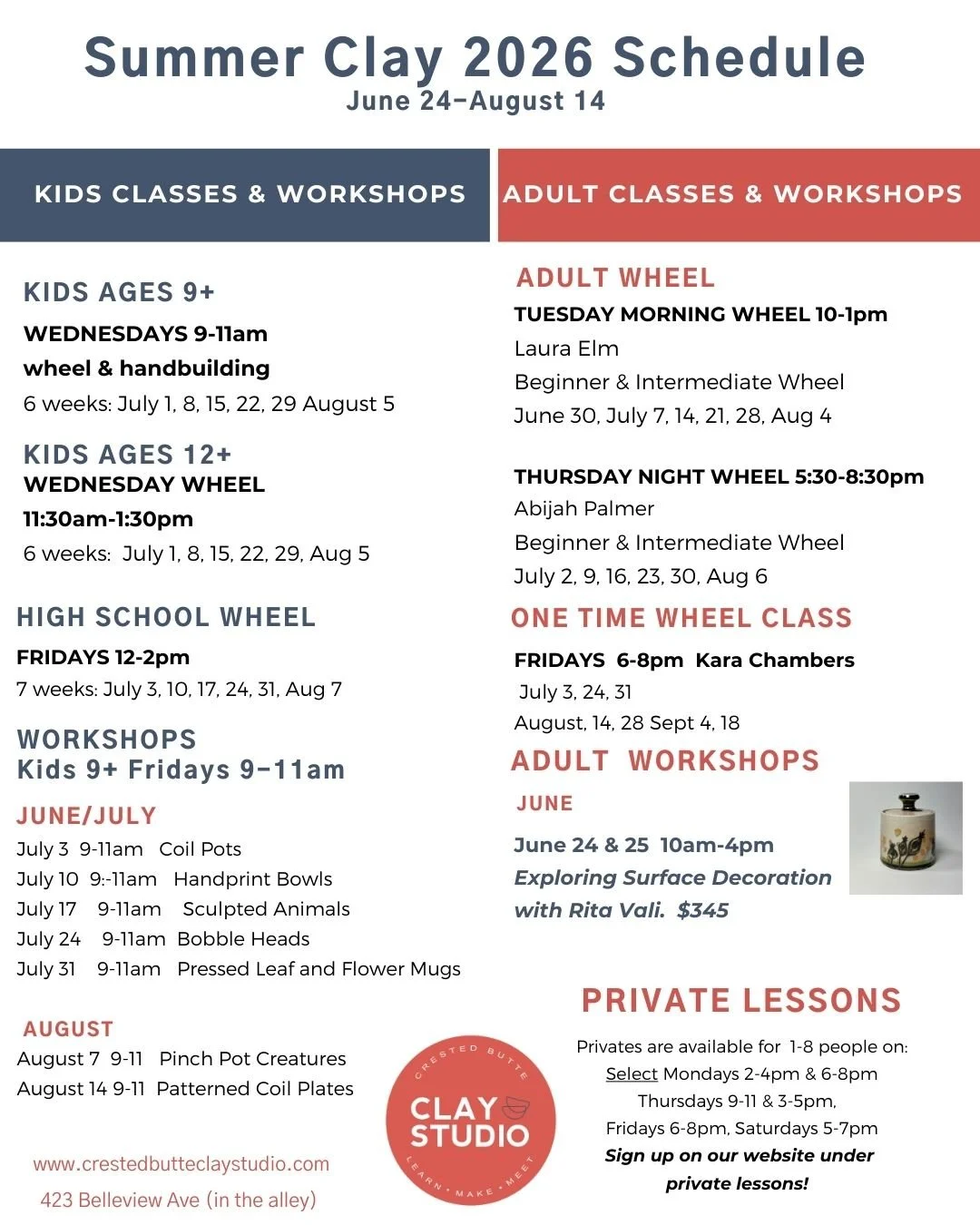 Crested Butte Clay Studio is a fully equipped ceramic studio offering memberships to self-guided ceramic artists, classes for all ages, a gallery and a fun and safe environment to create and more.